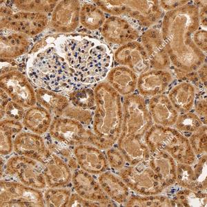 IHC检测RRBP1蛋白(货号 GB115084). 样品: 大鼠肾, 4%多聚甲醛 (货号G1101) 固定12-24小时. 抗原修复: Tris-EDTA抗原修复液(pH 9.0) (G1203), 98℃, 20分钟. —抗: 1: 600稀释, 4℃ 孵育过夜. 二抗: HRP标记山羊抗兔IgG (H+L) (货号GB23303), 1: 200稀释, 室温孵育1小时. |
