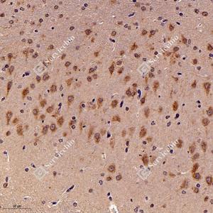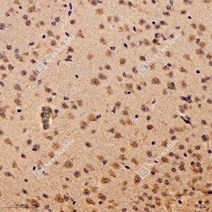 IHC检测RRBP1蛋白(货号 GB115084). 样品: 小鼠脑, 4%多聚甲醛 (货号G1101) 固定12-24小时. 抗原修复: Tris-EDTA抗原修复液(pH 9.0) (G1203), 98℃, 20分钟. —抗: 1: 600稀释, 4℃ 孵育过夜. 二抗: HRP标记山羊抗兔IgG (H+L) (货号GB23303), 1: 200稀释, 室温孵育1小时. |