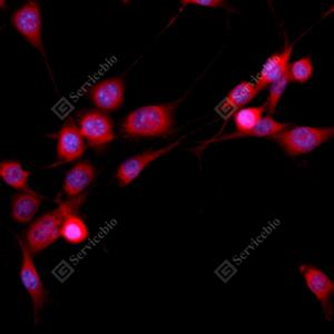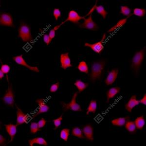 ICC检测RRBP1蛋白(货号 GB115084)(红色). 样品: NIH-3T3细胞, 4%多聚甲醛 (货号G1101) 固定20分钟. 封闭: 3% BSA(货号GC305010)的PBS溶液, 室温孵育30分钟. —抗: 1: 50稀释, 4℃ 孵育过夜. 二抗: Cy3标记山羊抗兔IgG (H+L) (货号GB21303), 1: 300稀释, 室温孵育1小时. |