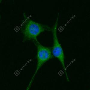 ICC检测MRPL24蛋白(货号 GB111790)(绿色). 样品: NIH-3T3细胞, 4%多聚甲醛 (货号G1101) 固定20分钟. 封闭: 3% BSA(货号GC305010)的PBS溶液, 室温孵育30分钟. 一抗: 1: 100稀释, 4℃ 孵育过夜. 二抗: Alexa Fluor 488标记山羊抗兔IgG (H+L) (货号GB25303), 1: 400稀释, 室温孵育1小时. |