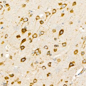 IHC检测MRPL39蛋白(货号 GB111367). 样品: 大鼠脑, 4%多聚甲醛 (货号G1101) 固定12-24小时. 抗原修复: 柠檬酸抗原修复液(干粉, pH 6.0) (G1201), 98℃, 20分钟. —抗: 1: 400稀释, 4℃ 孵育过夜. 二抗: HRP标记山羊抗兔IgG (H+L) (货号GB23303), 1: 200稀释, 室温孵育1小时. |