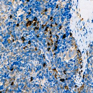 IHC检测MRPL39蛋白(货号 GB111367). 样品: 大鼠脾, 4%多聚甲醛 (货号G1101) 固定12-24小时. 抗原修复: 柠檬酸抗原修复液(干粉, pH 6.0) (G1201), 98℃, 20分钟. —抗: 1: 400稀释, 4℃ 孵育过夜. 二抗: HRP标记山羊抗兔IgG (H+L) (货号GB23303), 1: 200稀释, 室温孵育1小时. |