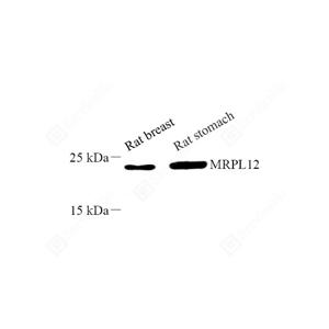 MRPL12 is a component of the 39S subunit of mammalian mitochondrial ribosomes, and is encoded by a nuclear gene. The protein forms a homodimer, localizes predominantly to mitochondria and binds to the large mitochondrial ribosomal subunit. It is required for CycD/Cdk4- induced cell growth. In addition, forming a ribosomal stalk with MRPL7, MRPL12 is required for the recruitment of translation elongation factors Tu and G to the large ribosomal subunit . It also a part of a novel regulatory mechanism that coordinates mitochondrial transcription with translation and/or ribosome biogenesis during human mitochondrial gene expression.