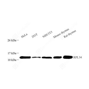 WB检测RPL34蛋白(货号 GB112367). 样品: 经RIPA裂解液(货号G2002)处理的蛋白质. 封闭: 3%脱脂牛奶(货号GC310001)溶于TBST溶液, 室温孵育1小时. —抗: 1: 500稀释, 4℃ 孵育过夜. 二抗: HRP标记山羊抗兔IgG (H+L) (货号GB23303), 1: 5000稀释, 室温孵育1小时. |