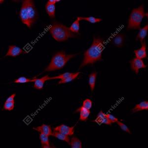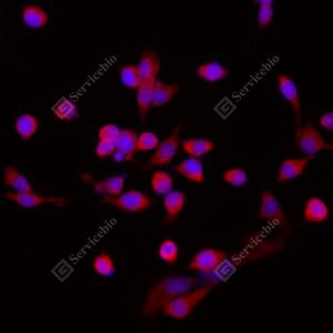 ICC检测RPL34蛋白(货号 GB112367)(红色). 样品: NIH-3T3细胞, 4%多聚甲醛 (货号G1101) 固定20分钟. 封闭: 3% BSA(货号GC305010)的PBS溶液, 室温孵育30分钟. 一抗: 1: 100稀释, 4℃ 孵育过夜. 二抗: Cy3标记山羊抗兔IgG (H+L) (货号GB21303), 1: 300稀释, 室温孵育1小时. |