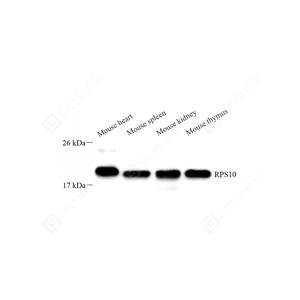 Ribosomes, the organelles that catalyze protein synthesis, are composed of a small subunit (40S) and a large subunit (60S) that consist of over 80 distinct ribosomal proteins. Mammalian ribosomal proteins are encoded by multigene families that contain processed pseudogenes and one functional intron-containing gene within their coding regions. Ribosomal Protein S10 (RPS10) is a 165 amino acid component of the small ribosomal 40S subunit. While generally found in the cytoplasm, RPS10 can localize to the granular component (GC) region of the nucleolus. For this to occur, methylation by PRMT5 is required as well as an interaction with NPS1. Defects in RPS10 are the cause of Diamond-Blackfan anemia type 9 (DBA9).