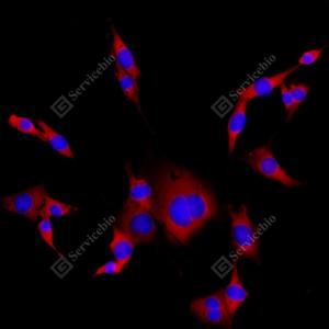 ICC检测RPS10蛋白(货号 GB111838)(红色). 样品: Hela细胞, 4%多聚甲醛 (货号G1101) 固定20分钟. 封闭: 3% BSA(货号GC305010)的PBS溶液, 室温孵育30分钟. 一抗: 1: 100稀释, 4℃ 孵育过夜. 二抗: Cy3标记山羊抗兔IgG (H+L) (货号GB21303), 1: 300稀释, 室温孵育1小时. |