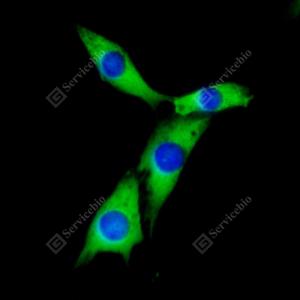 ICC检测RPS10蛋白(货号 GB111838)(绿色). 样品: NIH-3T3细胞, 4%多聚甲醛 (货号G1101) 固定20分钟. 封闭: 3% BSA(货号GC305010)的PBS溶液, 室温孵育30分钟. 一抗: 1: 100稀释, 4℃ 孵育过夜. 二抗: Alexa Fluor 488标记山羊抗兔IgG (H+L) (货号GB25303), 1: 400稀释, 室温孵育1小时. |