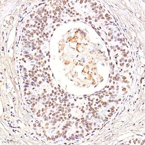IHC检测Estrogen Receptor alpha蛋白(货号 GB121844). 样品: 人乳腺癌, 4%多聚甲醛 (货号G1101) 固定12-24小时. 抗原修复: 柠檬酸抗原修复液(干粉, pH 6.0) (G1201), 高压锅均匀喷气计时2分钟. —抗: 1: 1000稀释, 4℃ 孵育过夜. 二抗: HRP标记山羊抗小鼠IgG (H+L) (货号GB23301), 1: 200稀释, 室温孵育1小时. |