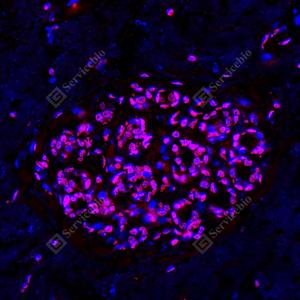 IF检测Estrogen Receptor alpha蛋白(货号 GB121844)(红色). 样品: 人乳腺, 4%多聚甲醛 (货号G1101) 固定12-24小时. 抗原修复: 柠檬酸抗原修复液(干粉, pH 6.0) (G1201), 高压锅均匀喷气计时2分钟. 封闭: 3% BSA(货号GC305010)的PBS溶液, 室温孵育30分钟. —抗: 1: 500稀释, 4℃ 孵育过夜. 二抗: Cy3标记山羊抗小鼠IgG (H+L) (货号GB21301), 1: 300稀释, 室温孵育1小时. |