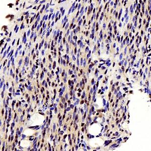 IHC检测Estrogen Receptor beta蛋白(货号 GB11268). 样品: 小鼠卵巢, 4%多聚甲醛 (货号G1101) 固定12-24小时. 抗原修复: 柠檬酸抗原修复液(干粉, pH 6.0) (G1201), 98℃, 20分钟. —抗: 1: 200稀释, 4℃ 孵育过夜. 二抗: HRP标记山羊抗兔IgG (H+L) (货号GB23303), 1: 200稀释, 室温孵育1小时. |