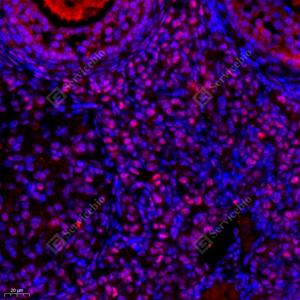 IF检测Estrogen Receptor beta蛋白(货号 GB11268)(红色). 样品: 小鼠卵巢, 4%多聚甲醛 (货号G1101) 固定12-24小时. 抗原修复: Tris-EDTA抗原修复液(pH 9.0) (G1203), 98℃, 20分钟. 封闭: 3% BSA(货号GC305010)的PBS溶液, 室温孵育30分钟. —抗: 1: 500稀释, 4℃ 孵育过夜. 二抗: Cy3标记山羊抗兔IgG (H+L) (货号GB21303), 1: 300稀释, 室温孵育1小时. |