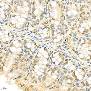 IHC检测PTMA蛋白(货号 GB111050). 样品: 小鼠结肠, 4%多聚甲醛 (货号G1101) 固定12-24小时. 抗原修复: 柠檬酸抗原修复液(干粉, pH 6.0) (G1201), 98℃, 20分钟. —抗: 1: 1500稀释, 4℃ 孵育过夜. 二抗: HRP标记山羊抗兔IgG (H+L) (货号GB23303), 1: 200稀释, 室温孵育1小时. |