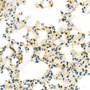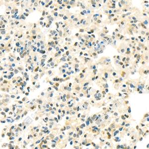 IHC检测PTMA蛋白(货号 GB111050). 样品: 小鼠肺, 4%多聚甲醛 (货号G1101) 固定12-24小时. 抗原修复: 柠檬酸抗原修复液(干粉, pH 6.0) (G1201), 98℃, 20分钟. —抗: 1: 750稀释, 4℃ 孵育过夜. 二抗: HRP标记山羊抗兔IgG (H+L) (货号GB23303), 1: 200稀释, 室温孵育1小时. |
