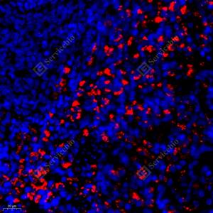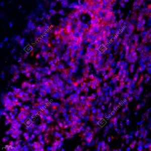 IF检测PTMA蛋白(货号 GB111050)(红色). 样品: 人淋巴结, 4%多聚甲醛 (货号G1101) 固定12-24小时. 抗原修复: Tris-EDTA抗原修复液(pH 9.0) (G1203), 98℃, 20分钟. 封闭: 3% BSA(货号GC305010)的PBS溶液, 室温孵育30分钟. —抗: 1: 1500稀释, 4℃ 孵育过夜. 二抗: Cy3标记山羊抗兔IgG (H+L) (货号GB21303), 1: 300稀释, 室温孵育1小时. |