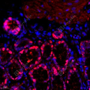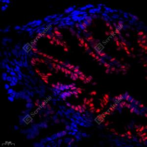 IF检测PTMA蛋白(货号 GB111050)(红色). 样品: 大鼠结肠, 4%多聚甲醛 (货号G1101) 固定12-24小时. 抗原修复: Tris-EDTA抗原修复液(pH 9.0) (G1203), 98℃, 20分钟. 封闭: 3% BSA(货号GC305010)的PBS溶液, 室温孵育30分钟. —抗: 1: 1500稀释, 4℃ 孵育过夜. 二抗: Cy3标记山羊抗兔IgG (H+L) (货号GB21303), 1: 300稀释, 室温孵育1小时. |