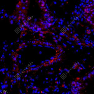 IF检测PTMA蛋白(货号 GB111050)(红色). 样品: 小鼠肺, 4%多聚甲醛 (货号G1101) 固定12-24小时. 抗原修复: Tris-EDTA抗原修复液(pH 9.0) (G1203), 98℃, 20分钟. 封闭: 3% BSA(货号GC305010)的PBS溶液, 室温孵育30分钟. —抗: 1: 1000稀释, 4℃ 孵育过夜. 二抗: Cy3标记山羊抗兔IgG (H+L) (货号GB21303), 1: 300稀释, 室温孵育1小时. |