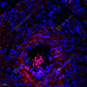 IF检测PTMA蛋白(货号 GB111050)(红色). 样品: 小鼠卵巢, 4%多聚甲醛 (货号G1101) 固定12-24小时. 抗原修复: Tris-EDTA抗原修复液(pH 9.0) (G1203), 98℃, 20分钟. 封闭: 3% BSA(货号GC305010)的PBS溶液, 室温孵育30分钟. —抗: 1: 1000稀释, 4℃ 孵育过夜. 二抗: Cy3标记山羊抗兔IgG (H+L) (货号GB21303), 1: 300稀释, 室温孵育1小时. |