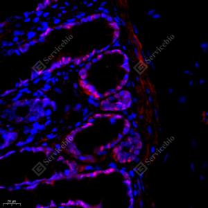 IF检测PTMA蛋白(货号 GB111050)(红色). 样品: 大鼠结肠, 4%多聚甲醛 (货号G1101) 固定12-24小时. 抗原修复: Tris-EDTA抗原修复液(pH 9.0) (G1203), 98℃, 20分钟. 封闭: 3% BSA(货号GC305010)的PBS溶液, 室温孵育30分钟. —抗: 1: 1000稀释, 4℃ 孵育过夜. 二抗: Cy3标记山羊抗兔IgG (H+L) (货号GB21303), 1: 300稀释, 室温孵育1小时. |