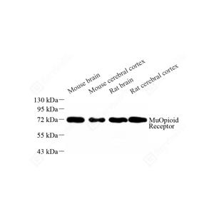 WB检测Mu Opioid Receptor蛋白(货号 GB112097). 样品: 经RIPA裂解液(货号G2002)处理的蛋白质. 封闭: 封闭: 3%脱脂牛奶(货号GC310001)溶于TBST溶液, 室温孵育1小时. —抗: 1: 250稀释, 4℃ 孵育过夜. 二抗: HRP标记山羊抗兔IgG (H+L) (货号GB23303), 1: 5000稀释, 室温孵育1小时. |