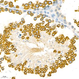 IHC检测Thyroid Hormone Receptor alpha蛋白(货号 GB111289). 样品: 小鼠睾丸, 4%多聚甲醛 (货号G1101) 固定12-24小时. 抗原修复: 柠檬酸抗原修复液(干粉, pH 6.0) (G1201), 98℃, 20分钟. —抗: 1: 1000稀释, 4℃ 孵育过夜. 二抗: HRP标记山羊抗兔IgG (H+L) (货号GB23303), 1: 200稀释, 室温孵育1小时. |