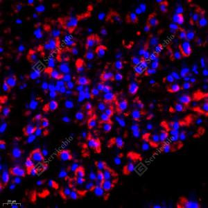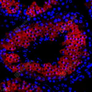 IF检测Thyroid Hormone Receptor alpha蛋白(货号 GB111289)(红色). 样品: 小鼠睾丸, 4%多聚甲醛 (货号G1101) 固定12-24小时. 抗原修复: Tris-EDTA抗原修复液(pH 9.0) (G1203), 98℃, 20分钟. 封闭: 3% BSA(货号GC305010)的PBS溶液, 室温孵育30分钟. —抗: 1: 1000稀释, 4℃ 孵育过夜. 二抗: Cy3标记山羊抗兔IgG (H+L) (货号GB21303), 1: 300稀释, 室温孵育1小时. |