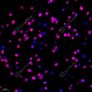 IF检测Thyroid Hormone Receptor alpha蛋白(货号 GB111289)(红色). 样品: 小鼠脑, 4%多聚甲醛 (货号G1101) 固定12-24小时. 抗原修复: Tris-EDTA抗原修复液(pH 9.0) (G1203), 98℃, 20分钟. 封闭: 3% BSA(货号GC305010)的PBS溶液, 室温孵育30分钟. —抗: 1: 1000稀释, 4℃ 孵育过夜. 二抗: Cy3标记山羊抗兔IgG (H+L) (货号GB21303), 1: 300稀释, 室温孵育1小时. |