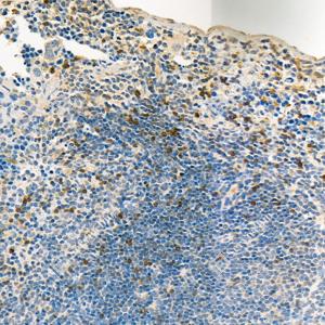 IHC检测Oxytocin Receptor蛋白(货号 GB112522). 样品: 小鼠脾, 4%多聚甲醛 (货号G1101) 固定12-24小时. 抗原修复: 柠檬酸抗原修复液(干粉, pH 6.0) (G1201), 98℃, 20分钟. —抗: 1: 500稀释, 4℃ 孵育过夜. 二抗: HRP标记山羊抗兔IgG (H+L) (货号GB23303), 1: 200稀释, 室温孵育1小时. |