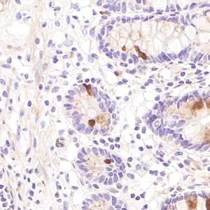 IHC检测Peptide YY/PYY蛋白(货号 GB115088). 样品: 小鼠结肠, 4%多聚甲醛 (货号G1101) 固定12-24小时. 抗原修复: Tris-EDTA抗原修复液(pH 9.0) (G1203), 98℃, 20分钟. —抗: 1: 600稀释, 4℃ 孵育过夜. 二抗: HRP标记山羊抗兔IgG (H+L) (货号GB23303), 1: 200稀释, 室温孵育1小时. |