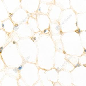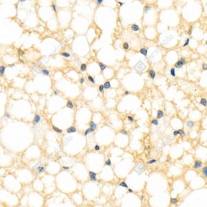 IHC检测Resistin蛋白(货号 GB112526). 样品: 大鼠白色脂肪, 4%多聚甲醛 (货号G1101) 固定12-24小时. 抗原修复: 柠檬酸抗原修复液(干粉, pH 6.0) (G1201), 98℃, 20分钟. —抗: 1: 800稀释, 4℃ 孵育过夜. 二抗: HRP标记山羊抗兔IgG (H+L) (货号GB23303), 1: 200稀释, 室温孵育1小时. |