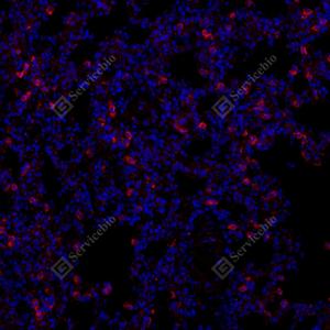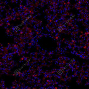 IF检测Sortilin/NT3蛋白(货号 GB112528)(红色). 样品: 小鼠肺, 4%多聚甲醛 (货号G1101) 固定12-24小时. 抗原修复: Tris-EDTA抗原修复液(pH 9.0) (G1203), 98℃, 20分钟. 封闭: 3% BSA(货号GC305010)的PBS溶液, 室温孵育30分钟. —抗: 1: 1600稀释, 4℃ 孵育过夜. 二抗: Cy3标记山羊抗兔IgG (H+L) (货号GB21303), 1: 300稀释, 室温孵育1小时. |