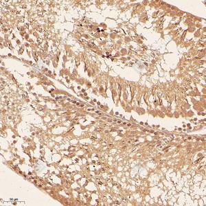 IHC检测IRAK1-binding protein 1蛋白(货号 GB115350). 样品: 小鼠睾丸, 4%多聚甲醛 (货号G1101) 固定12-24小时. 抗原修复: Tris-EDTA抗原修复液(pH 9.0) (G1203), 98℃, 20分钟. —抗: 1: 1000稀释, 4℃ 孵育过夜. 二抗: HRP标记山羊抗兔IgG (H+L) (货号GB23303), 1: 200稀释, 室温孵育1小时. |