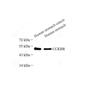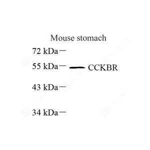WB检测CCK2-R蛋白(货号 GB11686). 样品: 经RIPA裂解液(货号G2002)处理的蛋白质. 封闭: 封闭: 3%脱脂牛奶(货号GC310001)溶于TBST溶液, 室温孵育1小时. —抗: 1: 500稀释, 4℃ 孵育过夜. 二抗: HRP标记山羊抗兔IgG (H+L) (货号GB23303), 1: 5000稀释, 室温孵育1小时. |