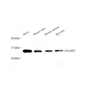 WB检测CRABP2蛋白(货号 GB111187). 样品: 经RIPA裂解液(货号G2002)处理的蛋白质. 封闭: 3%脱脂牛奶(货号GC310001)溶于TBST溶液, 室温孵育1小时. —抗: 1: 500稀释, 4℃ 孵育过夜. 二抗: HRP标记山羊抗兔IgG (H+L) (货号GB23303), 1: 5000稀释, 室温孵育1小时. |