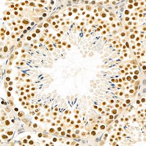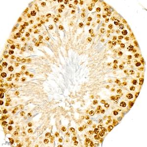 IHC检测CRABP2蛋白(货号 GB111187). 样品: 小鼠睾丸, 4%多聚甲醛 (货号G1101) 固定12-24小时. 抗原修复: 柠檬酸抗原修复液(干粉, pH 6.0) (G1201), 98℃, 20分钟. —抗: 1: 1200稀释, 4℃ 孵育过夜. 二抗: HRP标记山羊抗兔IgG (H+L) (货号GB23303), 1: 200稀释, 室温孵育1小时. |