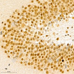 IHC检测CRABP2蛋白(货号 GB111187). 样品: 小鼠脑, 4%多聚甲醛 (货号G1101) 固定12-24小时. 抗原修复: 柠檬酸抗原修复液(干粉, pH 6.0) (G1201), 98℃, 20分钟. —抗: 1: 1200稀释, 4℃ 孵育过夜. 二抗: HRP标记山羊抗兔IgG (H+L) (货号GB23303), 1: 200稀释, 室温孵育1小时. |