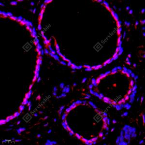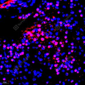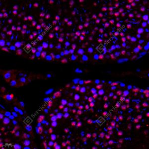 IF检测CRABP2蛋白(货号 GB111187)(红色). 样品: 大鼠睾丸, 4%多聚甲醛 (货号G1101) 固定12-24小时. 抗原修复: Tris-EDTA抗原修复液(pH 9.0) (G1203), 98℃, 20分钟. 封闭: 3% BSA(货号GC305010)的PBS溶液, 室温孵育30分钟. —抗: 1: 1000稀释, 4℃ 孵育过夜. 二抗: Cy3标记山羊抗兔IgG (H+L) (货号GB21303), 1: 300稀释, 室温孵育1小时. |
