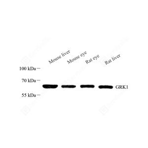 WB检测GRK1蛋白(货号 GB114023). 样品: 经RIPA裂解液(货号G2002)处理的蛋白质. 封闭: 3%脱脂牛奶(货号GC310001)溶于TBST溶液, 室温孵育1小时. —抗: 1: 1000稀释, 4℃ 孵育过夜. 二抗: HRP标记山羊抗兔IgG (H+L) (货号GB23303), 1: 5000稀释, 室温孵育1小时. |