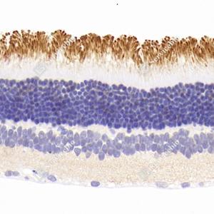 IHC检测GRK1蛋白(货号 GB114023). 样品: 大鼠眼球, 4%多聚甲醛 (货号G1101) 固定12-24小时. 抗原修复: 柠檬酸抗原修复液(干粉, pH 6.0) (G1201), 98℃, 20分钟. —抗: 1: 2000稀释, 4℃ 孵育过夜. 二抗: HRP标记山羊抗兔IgG (H+L) (货号GB23303), 1: 200稀释, 室温孵育1小时. |