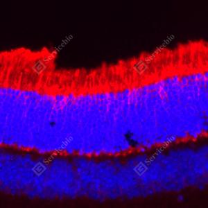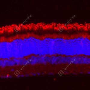 IF检测GRK1蛋白(货号 GB114023)(红色). 样品: 大鼠眼球, 4%多聚甲醛 (货号G1101) 固定12-24小时. 抗原修复: Tris-EDTA抗原修复液(pH 9.0) (G1203), 98℃, 20分钟. 封闭: 3% BSA(货号GC305010)的PBS溶液, 室温孵育30分钟. —抗: 1: 1500稀释, 4℃ 孵育过夜. 二抗: Cy3标记山羊抗兔IgG (H+L) (货号GB21303), 1: 300稀释, 室温孵育1小时. |