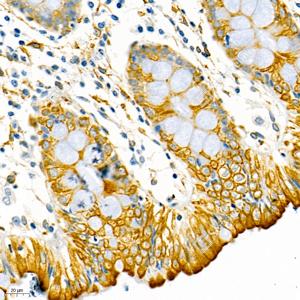 IHC检测Inhibin alpha蛋白(货号 GB11741). 样品: 人结肠, 4%多聚甲醛 (货号G1101) 固定12-24小时. 抗原修复: 柠檬酸抗原修复液(干粉, pH 6.0) (G1201), 98℃, 20分钟. —抗: 1: 800稀释, 4℃ 孵育过夜. 二抗: HRP标记山羊抗兔IgG (H+L) (货号GB23303), 1: 200稀释, 室温孵育1小时. |