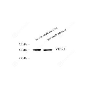 WB检测VPAC1蛋白(货号 GB111986). 样品: 经RIPA裂解液(货号G2002)处理的蛋白质. 封闭: 封闭: 3%脱脂牛奶(货号GC310001)溶于TBST溶液, 室温孵育1小时. —抗: 1: 250稀释, 4℃ 孵育过夜. 二抗: HRP标记山羊抗兔IgG (H+L) (货号GB23303), 1: 5000稀释, 室温孵育1小时. |