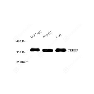 WB检测CRF-BP蛋白(货号 GB114810). 样品: 经RIPA裂解液(货号G2002)处理的蛋白质. 封闭: 3%脱脂牛奶(货号GC310001)溶于TBST溶液, 室温孵育1小时. —抗: 1: 1000稀释, 4℃ 孵育过夜. 二抗: HRP标记山羊抗兔IgG (H+L) (货号GB23303), 1: 5000稀释, 室温孵育1小时. |