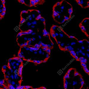 IF检测CSHL1蛋白(货号 GB114407)(红色). 样品: 人胎盘, 4%多聚甲醛 (货号G1101) 固定12-24小时. 抗原修复: Tris-EDTA抗原修复液(pH 9.0) (G1203), 98℃, 20分钟. 封闭: 3% BSA(货号GC305010)的PBS溶液, 室温孵育30分钟. —抗: 1: 800稀释, 4℃ 孵育过夜. 二抗: Cy3标记山羊抗兔IgG (H+L) (货号GB21303), 1: 300稀释, 室温孵育1小时. |