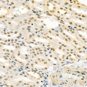 IHC检测GRK3蛋白(货号 GB112421). 样品: 小鼠肾, 4%多聚甲醛 (货号G1101) 固定12-24小时. 抗原修复: 柠檬酸抗原修复液(干粉, pH 6.0) (G1201), 98℃, 20分钟. —抗: 1: 400稀释, 4℃ 孵育过夜. 二抗: HRP标记山羊抗兔IgG (H+L) (货号GB23303), 1: 200稀释, 室温孵育1小时. |