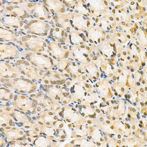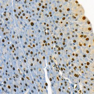 IHC检测GRK3蛋白(货号 GB112421). 样品: 大鼠胃, 4%多聚甲醛 (货号G1101) 固定12-24小时. 抗原修复: 柠檬酸抗原修复液(干粉, pH 6.0) (G1201), 98℃, 20分钟. —抗: 1: 400稀释, 4℃ 孵育过夜. 二抗: HRP标记山羊抗兔IgG (H+L) (货号GB23303), 1: 200稀释, 室温孵育1小时. |