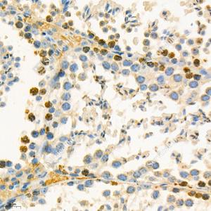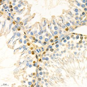 IHC检测GRK3蛋白(货号 GB112421). 样品: 小鼠睾丸, 4%多聚甲醛 (货号G1101) 固定12-24小时. 抗原修复: 柠檬酸抗原修复液(干粉, pH 6.0) (G1201), 98℃, 20分钟. —抗: 1: 400稀释, 4℃ 孵育过夜. 二抗: HRP标记山羊抗兔IgG (H+L) (货号GB23303), 1: 200稀释, 室温孵育1小时. |