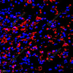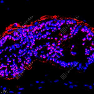 IF检测GRK3蛋白(货号 GB112421)(红色). 样品: 小鼠前列腺, 4%多聚甲醛 (货号G1101) 固定12-24小时. 抗原修复: Tris-EDTA抗原修复液(pH 9.0) (G1203), 98℃, 20分钟. 封闭: 3% BSA(货号GC305010)的PBS溶液, 室温孵育30分钟. —抗: 1: 400稀释, 4℃ 孵育过夜. 二抗: Cy3标记山羊抗兔IgG (H+L) (货号GB21303), 1: 300稀释, 室温孵育1小时. |