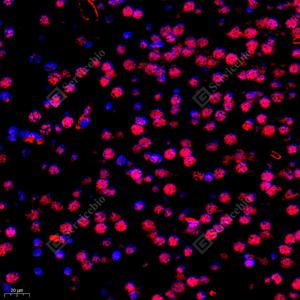 IF检测GRK3蛋白(货号 GB112421)(红色). 样品: 小鼠脑, 4%多聚甲醛 (货号G1101) 固定12-24小时. 抗原修复: Tris-EDTA抗原修复液(pH 9.0) (G1203), 98℃, 20分钟. 封闭: 3% BSA(货号GC305010)的PBS溶液, 室温孵育30分钟. —抗: 1: 400稀释, 4℃ 孵育过夜. 二抗: Cy3标记山羊抗兔IgG (H+L) (货号GB21303), 1: 300稀释, 室温孵育1小时. |