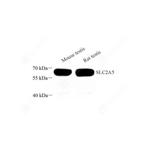 WB检测GLUT5蛋白(货号 GB114645). 样品: 经RIPA裂解液(货号G2002)处理的蛋白质. 封闭: 封闭: 3%脱脂牛奶(货号GC310001)溶于TBST溶液, 室温孵育1小时. —抗: 1: 800稀释, 4℃ 孵育过夜. 二抗: HRP标记山羊抗兔IgG (H+L) (货号GB23303), 1: 5000稀释, 室温孵育1小时. |